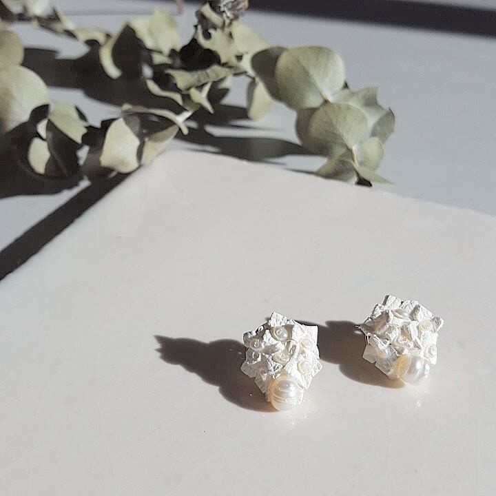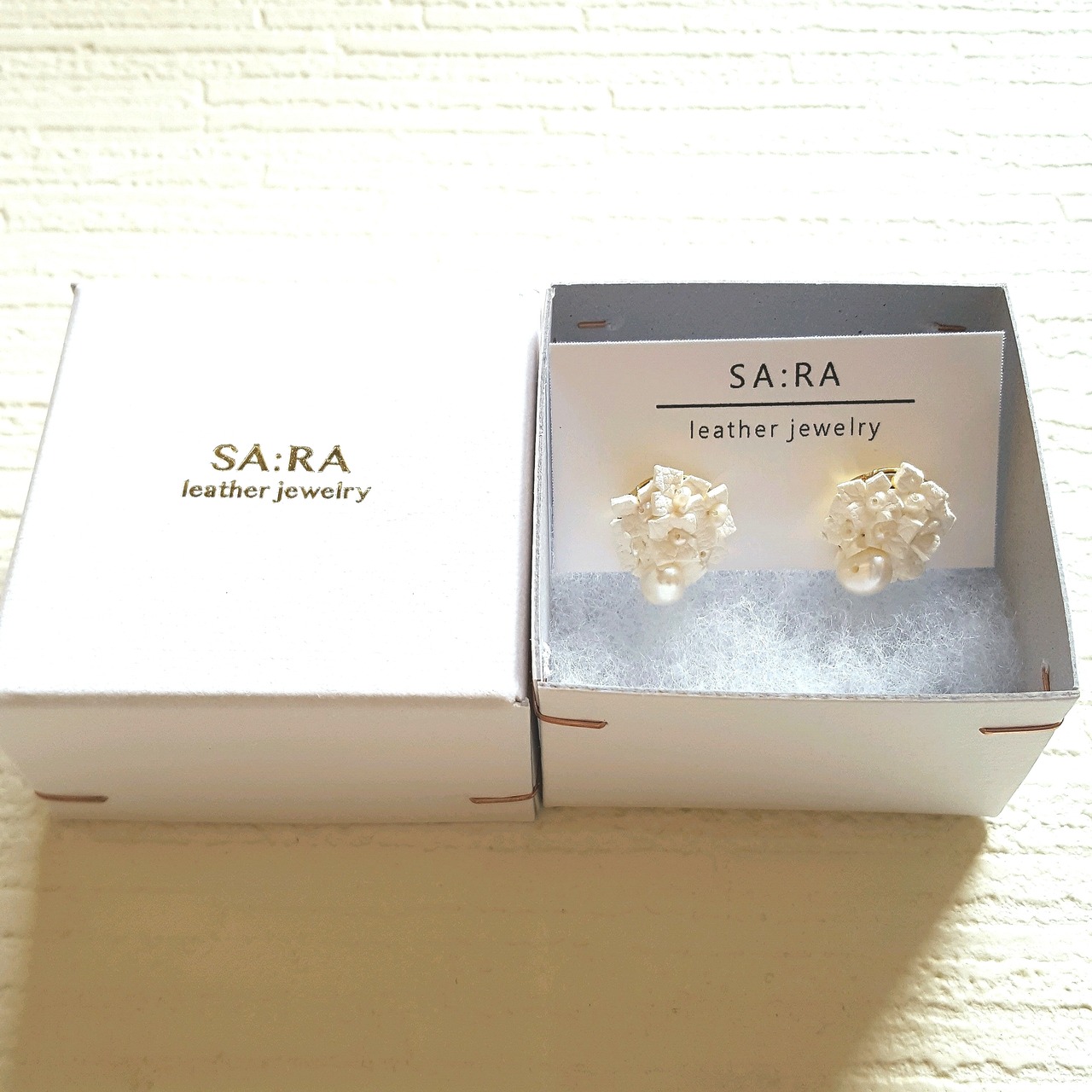 純白の豚革を小さなお花に一つ一つ手作業で仕立て、淡水パールで丁寧に縫い付けました。